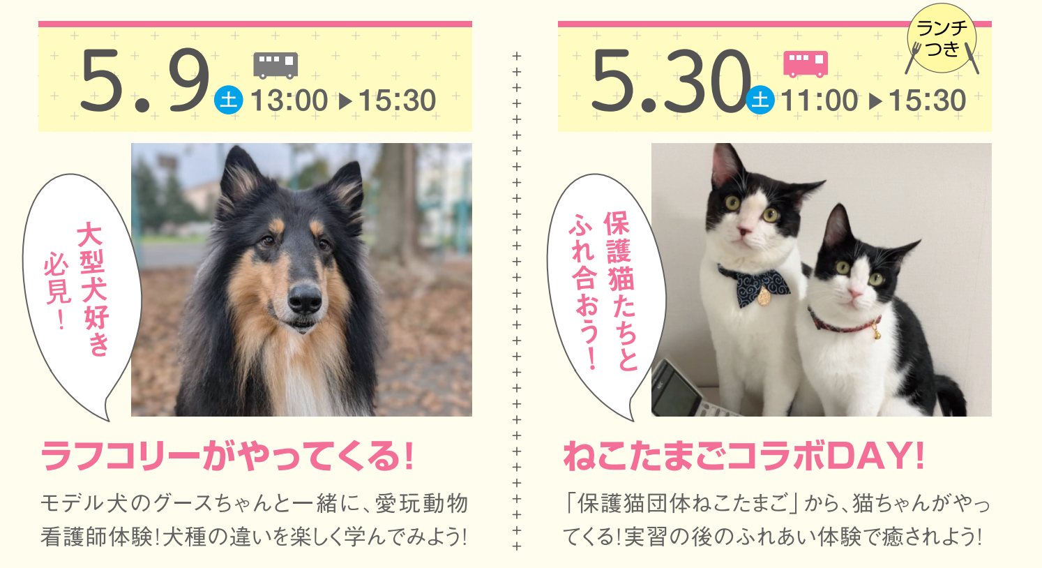 モデル犬たちと触れ合いながら楽しく体験しよう!